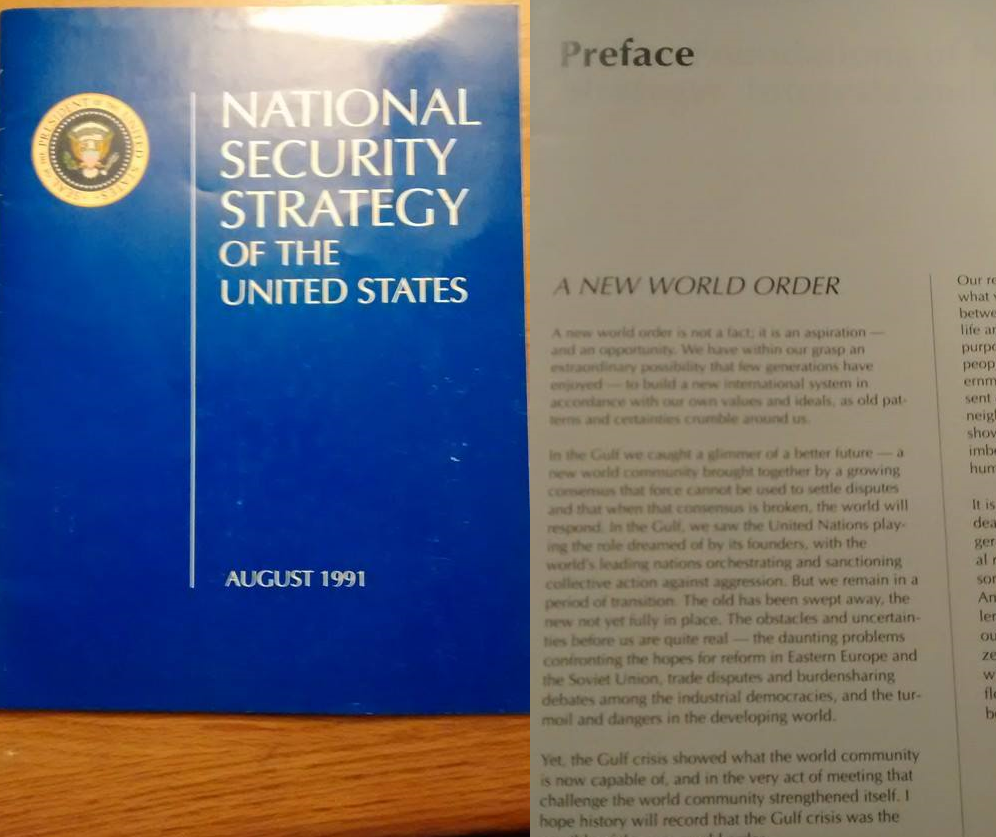 The office of the President of the United States published the booklet “National Security Strategy of the United States” in August of 1991 which opened by declaring Bush’s official policy of building a New World Order through the United Nations. That policy has never been repealed.